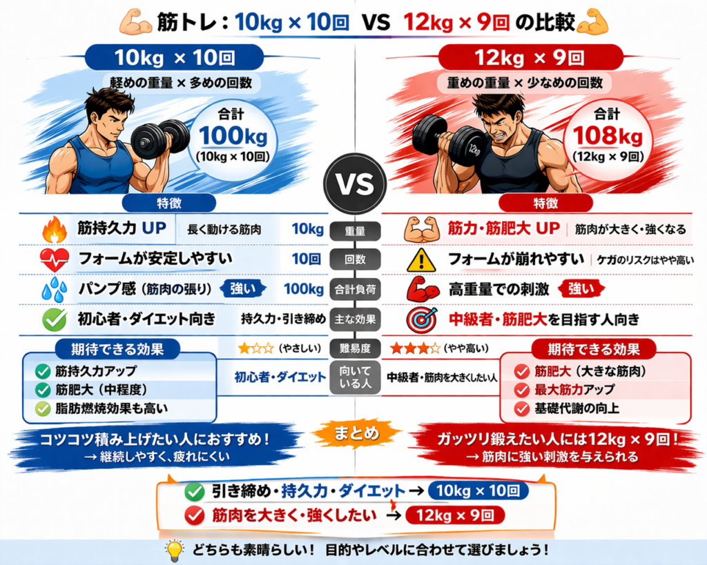 総負荷で見ると、12kg×9回 の方が大きくなります。